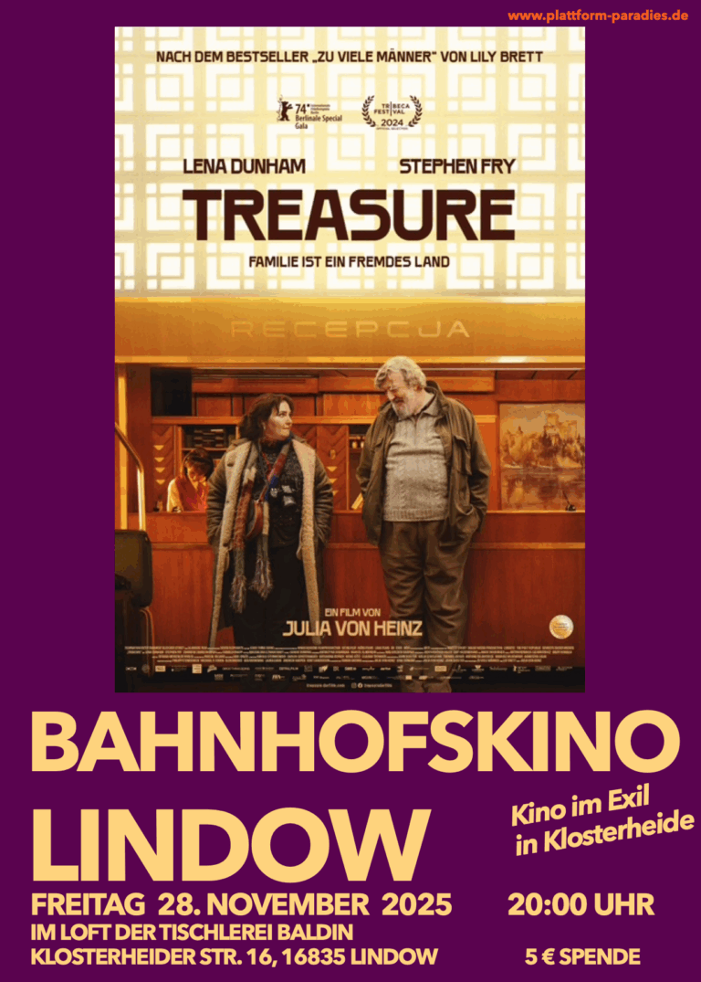 Am 28.11.2025 um 20 Uhr zeigen wir "TREASURE - Familie ist ein fremdes Land" im Loft der Tischlerei Baldin. Kurz nach dem Fall des Eisernen Vorhangs reist die New Yorker…