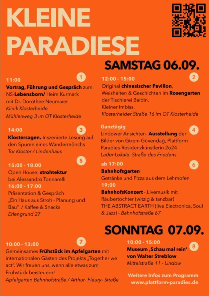 Die „Kleinen Paradiese“ finden seit 2022 statt. Wir freuen uns immer über neue Orte & Inhalte! Möchten Sie sich an den „Kleinen Paradiese“ beteiligen? Dann lassen Sie es uns wissen über info@plattform-paradies.de oder